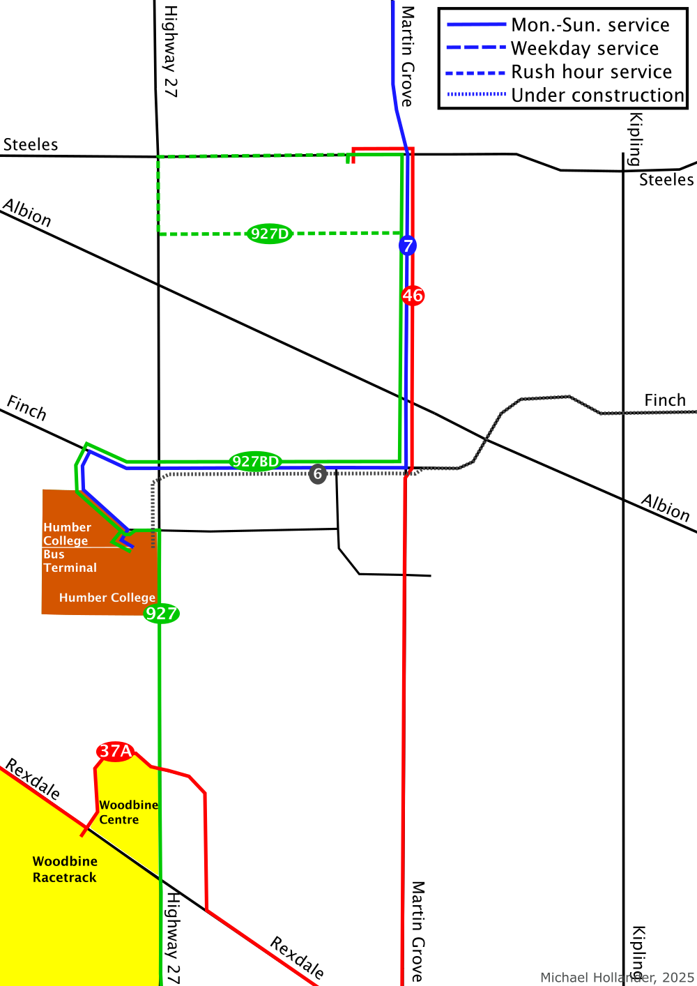 south of Humber College (who would need to walk to Highway 27 to take TTC route 927).