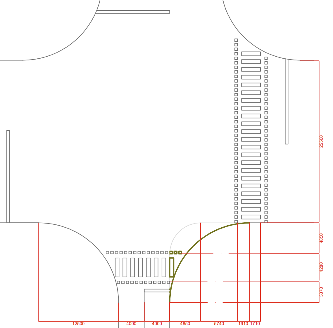 Buses exiting the terminal do not turn right on red despite no signs indicating such a movement is prohibited. However, due to the tight (4.85-metre) turning radius the bus must turn to one of the two left lanes rather than the right lane, preventing a safe turn during most of the signal cycle. A 12.5-metre radius like the one shown in the Figure (dimensions in millimetress) would allow a bus to avoid disrupting all traffic during its turns. Allowing the bus to turn right on red (as well as other signal adjustments) will require this remedy.